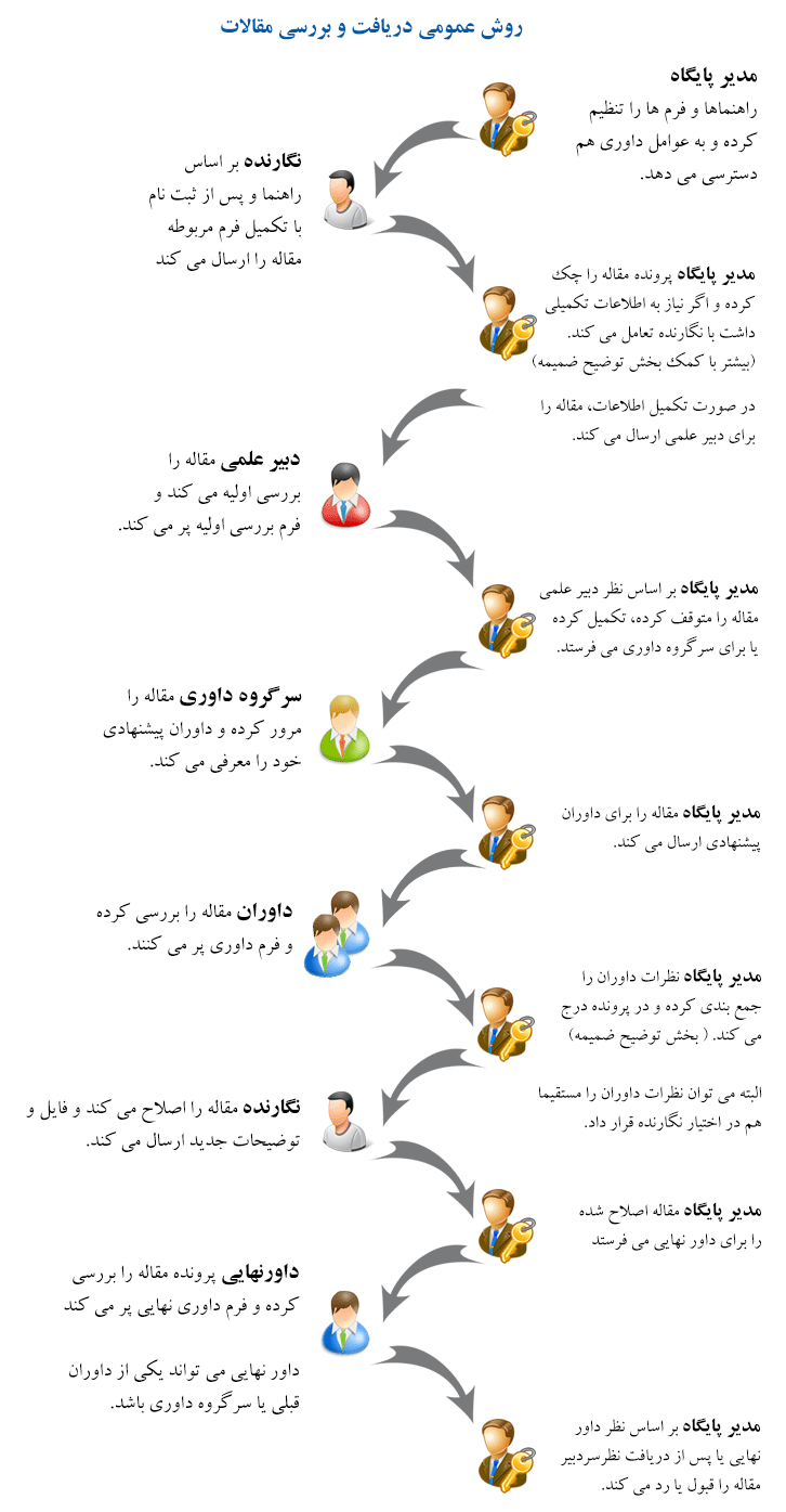 - کلیه مراحل اختیاری هستند و می توان از همه مراحل استفاده نکرد. مثلا مدیر می تواند مقاله را در هر مرحله قبول یا رد کند. امکان تنظیم مراحل فعال مورد نظر از طریق بخش تنظیمات داوری وجود دارد.