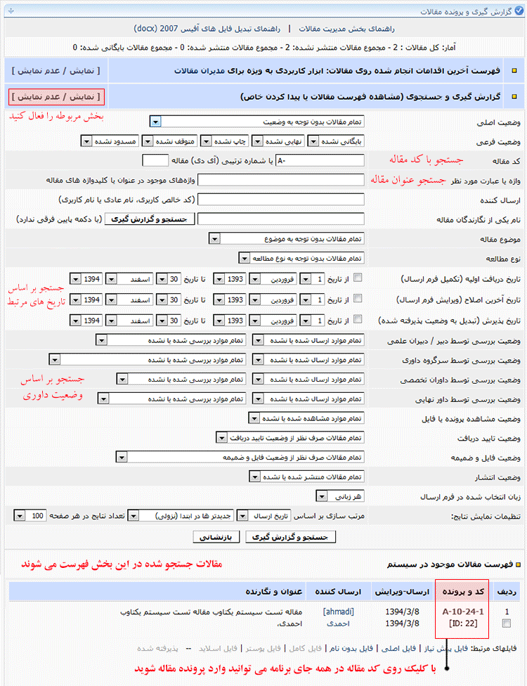 | بخش مقالات | فهرست و پرونده مقالات | جستجو و گزارش گیری از مقالات و ورود به پرونده مقالات برای انجام همه کارها روی مقالات |