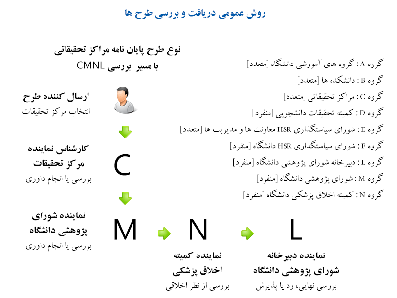 در هر مرحله نماینده هر سازمان می توان کلیه مراحل داوری (ارسال برای داور با فرم مورد نظر و دریافت نظرات داور) را انجام دهد. سپس بعد از اتمام کار خود طرح را برای مقصد بعدی ارسال می کند.