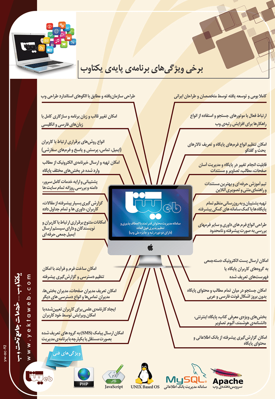 پایگاههای اینترنتی سازمانهای بزرگ، خود از مجموعه ای از پایگاههای فرعی تشکیل شدهاند. مدیریت یکپارچه اطلاعات عرضه شده در پایگاههای فرعی یکی از دغدغههای اصلی مدیران اینگونه پایگاههاست که با استفاده از نرمافزارهایی که ویژه این امر طراحی شدهاند میتوان راه حل مناسبی برای آن ارایه داد. در طراحی مجموعه یکتاوب سعی بر آن بوده است راهکار جامع و کارآمدی برای مدیریت یکپارچه اطلاعات پایگاههای سازمانی بزرگ فراهم شود.