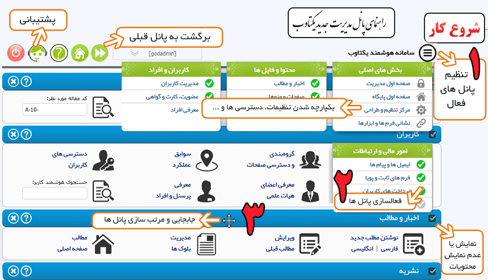 برای شروع کار در بخش مدیریت بخش های زیر را مشاهده کرده و تنظیمات موجود را بازبینی و تایید کنید.
